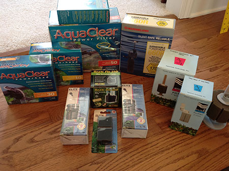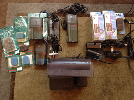 Duetto 50s $7 each, Duetto 100 $10, replacement filters included. Penguin Biowheel 200, full box C-size filters (qty:5) included: $20 (Qty:4) Air pumps for bubble filters, $2 each (Qty:4) Elite Submersible Mini Filter (recirc) - $4 |