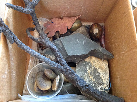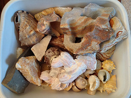 Various natural decor: soapstone, slate, shells, barnacles, carved stone. Small shells $1 each, large shells $2 each, stones $2 each. |