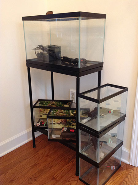 (Qty: 5) 2.5 gal tanks (great for Bettas!) with 7.5w Hydor ribbon heaters and bubble filters (pumps available $2 - see following), glass canopies (2 with backgrounds) $13 each